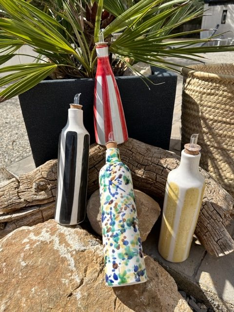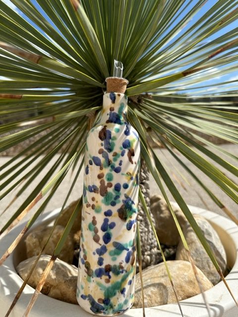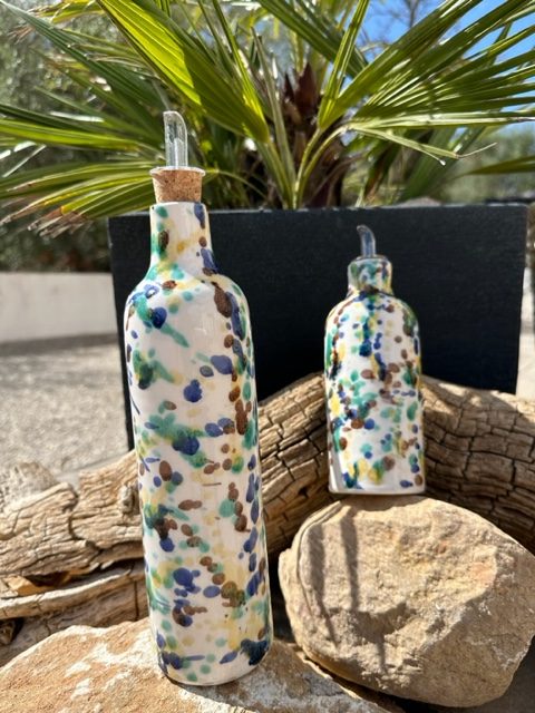 Wunderschöne Handgefertigte und lasierte Olivenöl & Essig Flasche in einer tollen Farbe Picasso